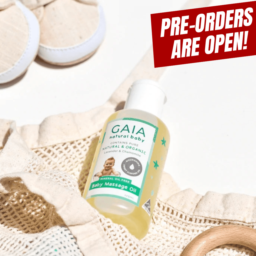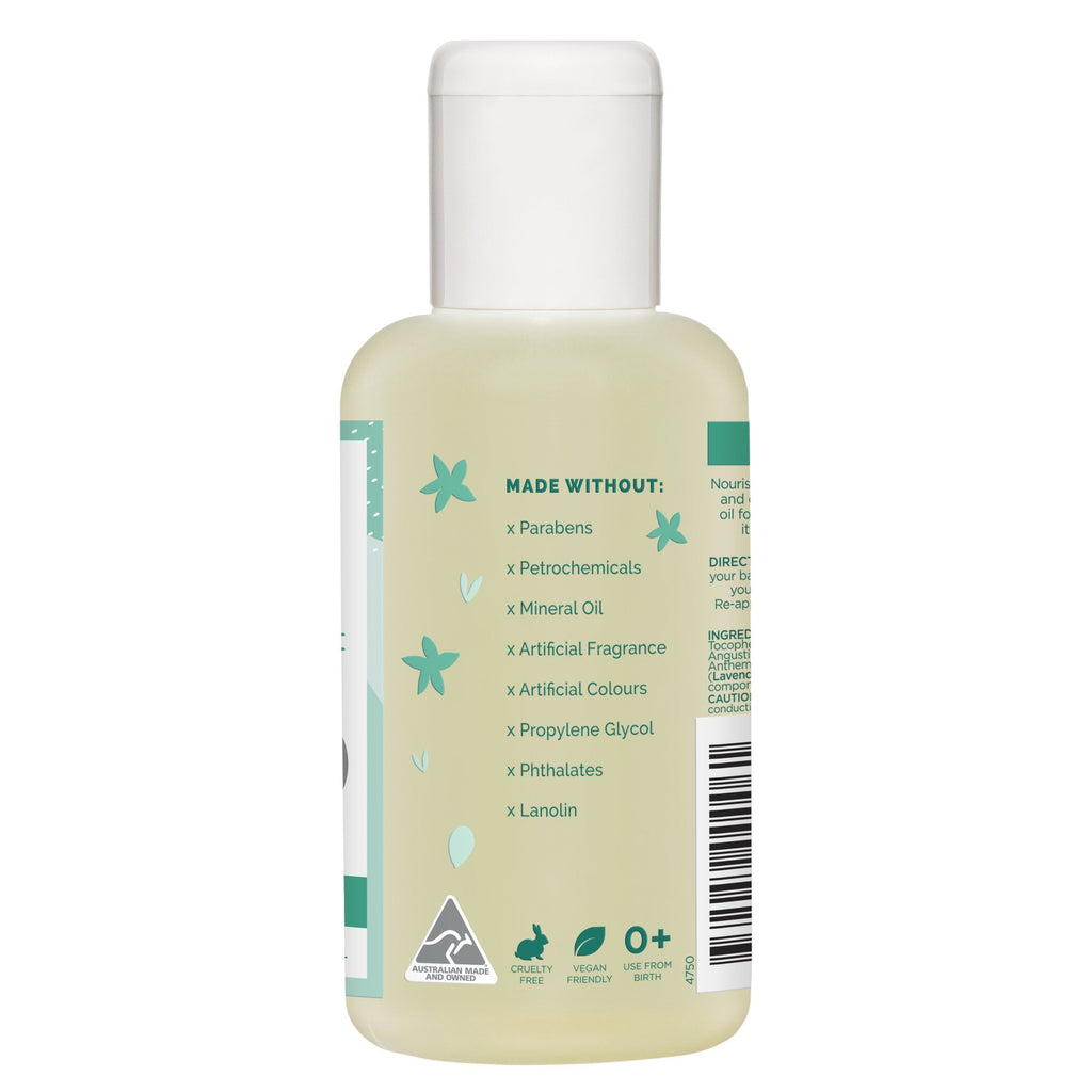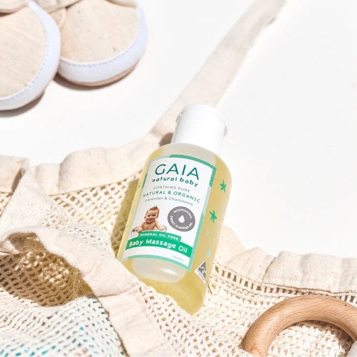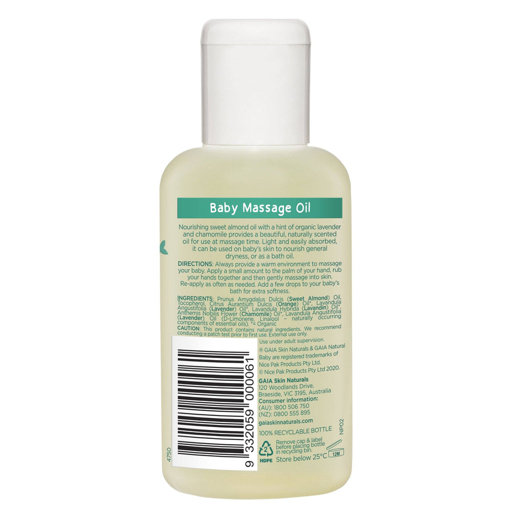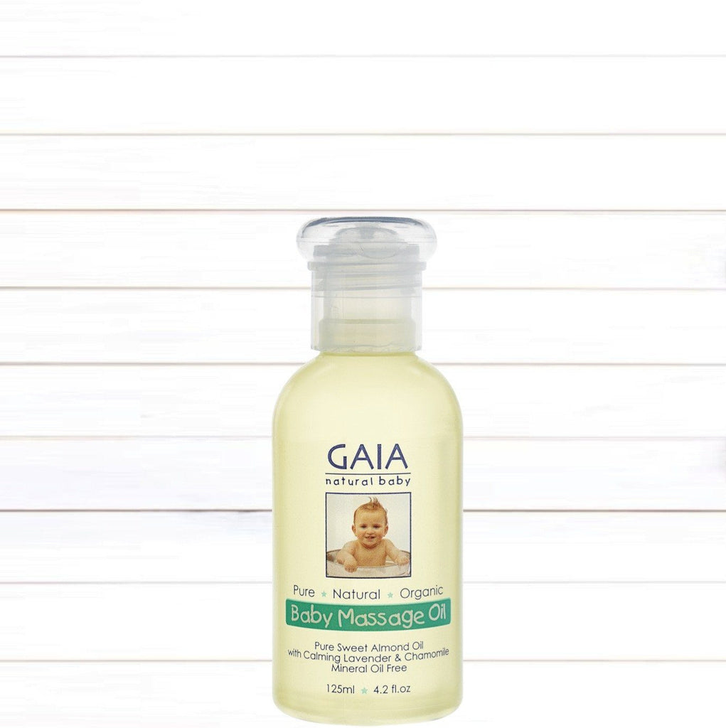 GAIA Natural Baby Massage Oil uses pure sweet almond oil and a hint of organic lavender and organic chamomile pure essential oils making your baby massage time calming and relaxing.