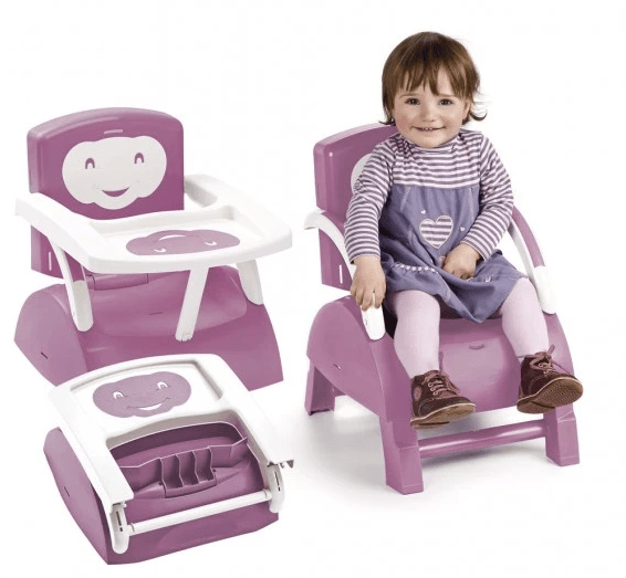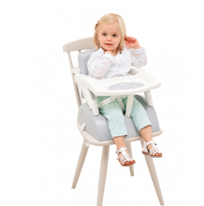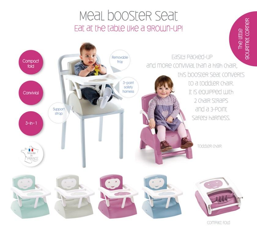 A smart booster seat / chair which become a little armchair when your child grows up, thanks to the legs folded under the base. Its removable tray is fixed to the back when not in use. Easy to fold and unfold, it is ultra compact for an easy transport.